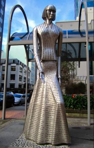 位于大街中段有个Midland Park (美德兰-我胡乱意译做中土公园)几根豆芽菜造型的喷泉之外,前几年又加了个三米高的不锈钢雕塑,纪念本市著名小说家凯瑟琳.曼斯菲尔德(徐志摩早年写文纪念她把她的名字翻成曼苏菲尔),裙子上是她作品里的文字,每次路过我都要看看上面的字,希望能多读出点内容。