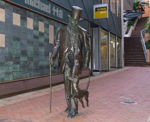 兰姆顿大道不止有商业,人流,各类游行,短短不到一公里的大道也颇有文化气息,好些吸引人的雕塑小品。靠近Willis Street一头的老银行拱廊the Old Bank Arcade购物楼对面小巷Plimmer Steps的巷口是被称为惠灵顿之父John Plimmer的雕塑,他戴着礼帽牵着自己的狗儿弗里茨Fritz的雕塑形象地反映了百年前老人在街头穿行的样子。