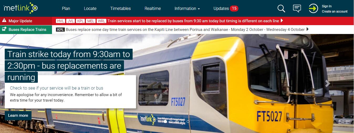 另据Metlink官网消息,铁路罢工从今天(10月4日)早上9点30分开始,于下午2点30分结束,罢工期间,乘客需要换乘公交车前往目的地。(查询具体换乘信息,请点击)