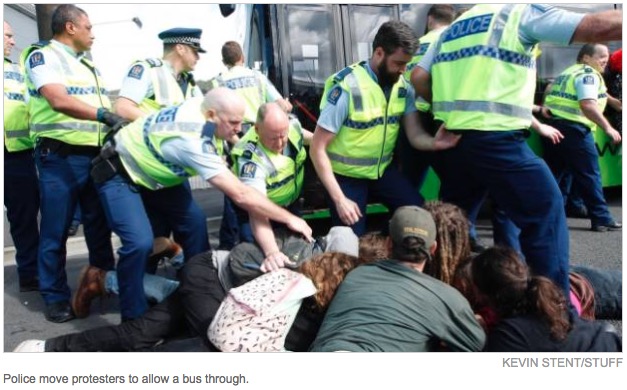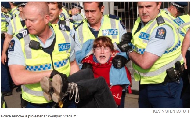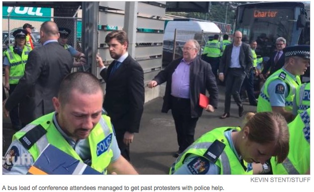 抗议人群阻拦参会车辆进入会场,警方随即将部分抗议者拉走,防止他们聚集,Waterloo Quay北行方向的车道因为抗议者的聚集和他们对体育场入口的封锁导致关闭。