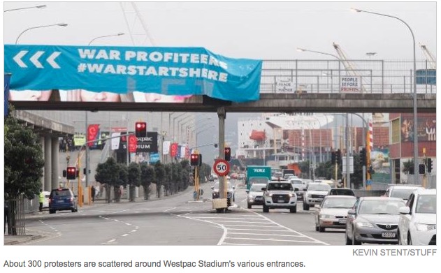 【10月10日天维网报道,援引Stuff消息】周二早晨(10月10日),大约300名反对使用武器的抗议者在惠灵顿Westpac Stadium外抗议并将体育场的所有出入口全部堵住,以抗议和组织原本计划进行的国防产业与国家安全论坛。