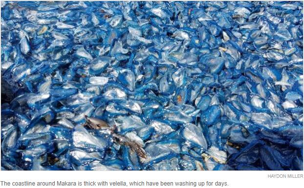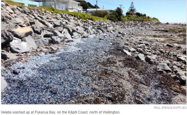 10月的早些时候,一大群僧帽水母被冲上靠近Nelson的Cable Bay,还有一大群水母被冲上靠近Taranaki的海岸边。
