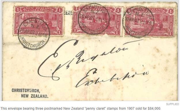 同一场拍卖会上,一个贴有3枚新西兰1907年版“Penny claret”邮票的信封被拍出84,000纽币的高价,这比它的售前估价还要高出4000纽币。