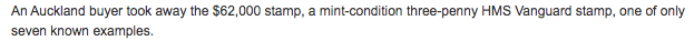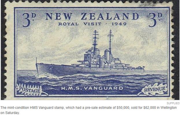 一名来自奥克兰的买家出价62,000纽币拍下了一枚3便士的HMS Vanguard邮票,它是已知仅有7枚样票中的其中1枚。