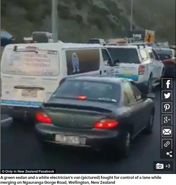 一台绿色的Sedan以及一台白色的电工面包车在惠灵顿1号高速Ngauranga Gorge Rd路口并道的时候,因为争抢车道而互不相让。他们谁都不愿意把车道让给对方,于是两辆车同时挤在越来越窄的车道上。当时路面还有许多车辆通行,他们争抢车道的行为被另外一台车上的司机录下来,发在了Facebook上。