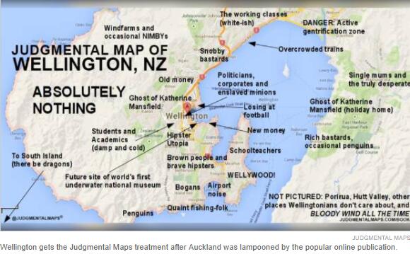 Aro Valley和Te Aro区被称为“时尚乌托邦”,而CBD被“政治家、商人还有被剥削的工人”所包围。Wadestown是“传统的富人区”,东方湾则是“新时代富人区”。住在Khandallah的亲们被称为“势利小人”,而他们北部的邻居Johnsonville则是“白领天堂”。