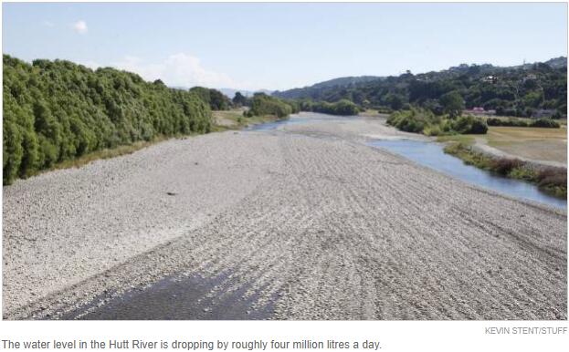 惠灵顿紧急供应水源来自Upper Hutt 的Te Marua湖,这个湖往年一直到一月底水量储存都非常充沛。然而现在,两个提供用水的湖泊中,有一个的蓄水量已经被消耗了十分之一。与此同时,Hutt River的蓄水量也正以每日400万升的速度被消耗着。
