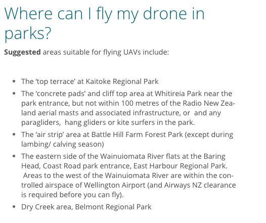 在惠灵顿大区,禁止使用无人机的公共区域包括:所有由市政厅规划的野餐区、露营区,为登山者单独开放的季节里Battle Hill Farm Forest Park及Belmont Regional Park ,以及所有的湿地及公园里的鸟类栖息地,所有距离公园建筑、停车场、车辆和船只30米以内区域。