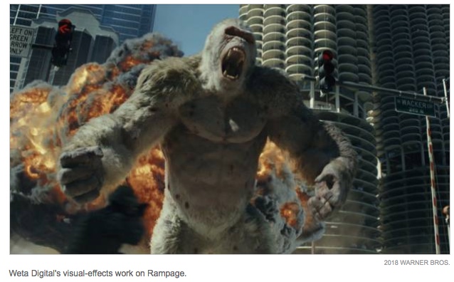 《Rampage/狂暴巨兽》里的猩猩George由Jason Liles扮演 ,对刚刚靠《War For The Planet of the Apes/猿星崛起3:终极之战》和《Guardians of The Galaxy Vol.2/银河护卫队2》提名了两项奥斯卡的Weta团队来说,这项工作算是轻车熟路了。