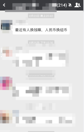 6月23日,他在另一个214人的微信群里第二次发布了换汇消息。