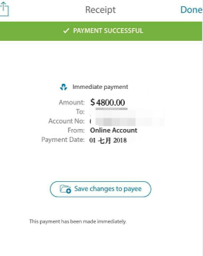 “当当”发给小张的银行转账截图显示,其转账时间是7月1日,因同为ANZ银行账户,应立刻到账,但是从小张给我们的银行交易记录来看,从7月1日至今也没有收到$4800的转账。