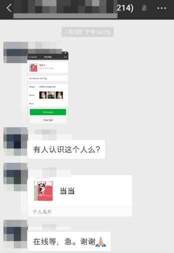 找不到“当当”的小张想到了自己发送换汇消息的微信群,于是她在群里发布了寻人消息。