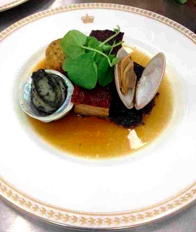 Braised Organic Pork Belly with buttered karengo, kumara, fondant, moon clams and cocktail paua