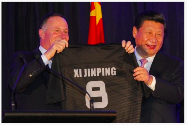 新西兰总理约翰·基今天下午在总理府向习近平主席赠送了一件写有拼音和数字8号的全黑球衣。