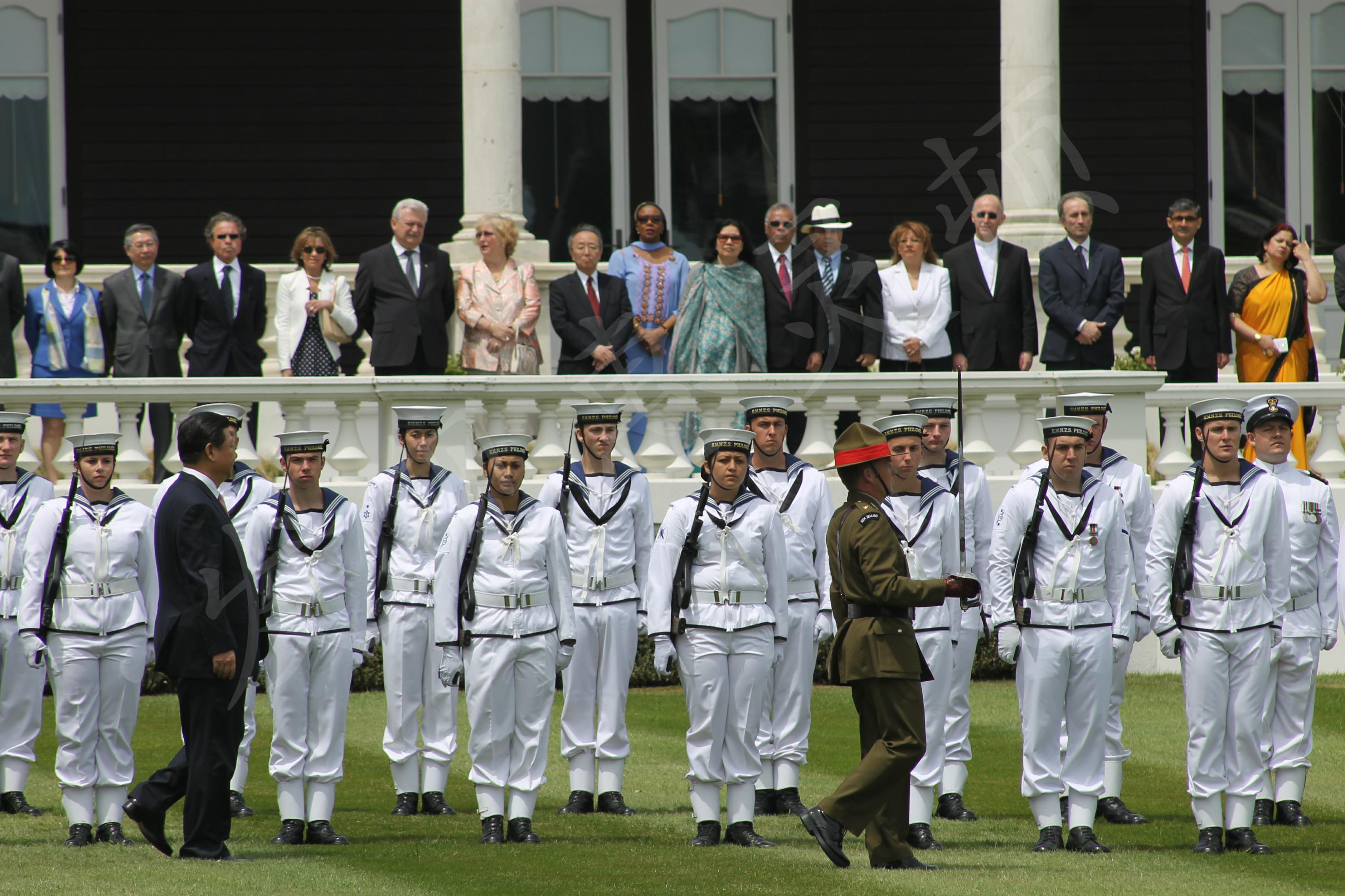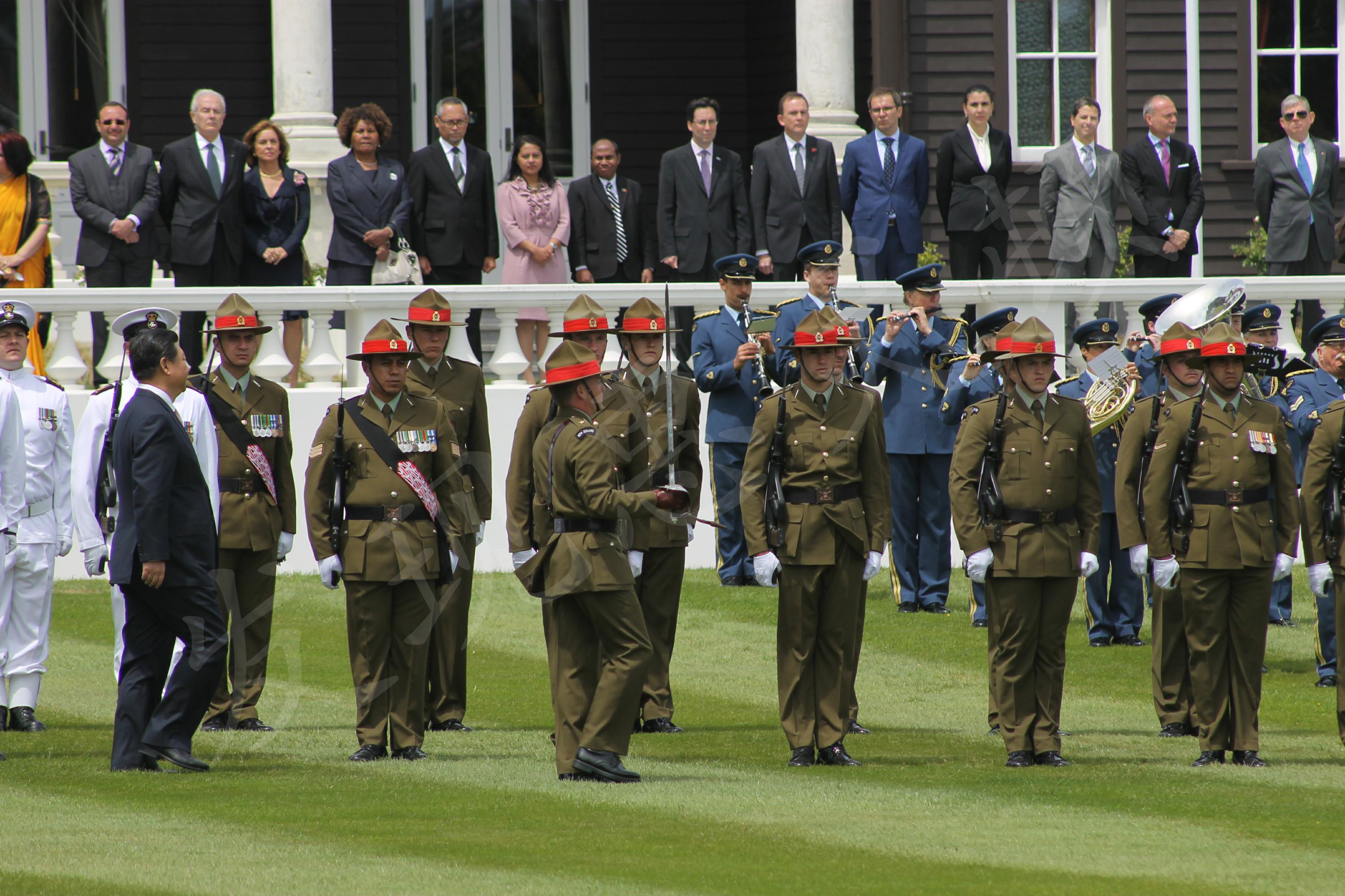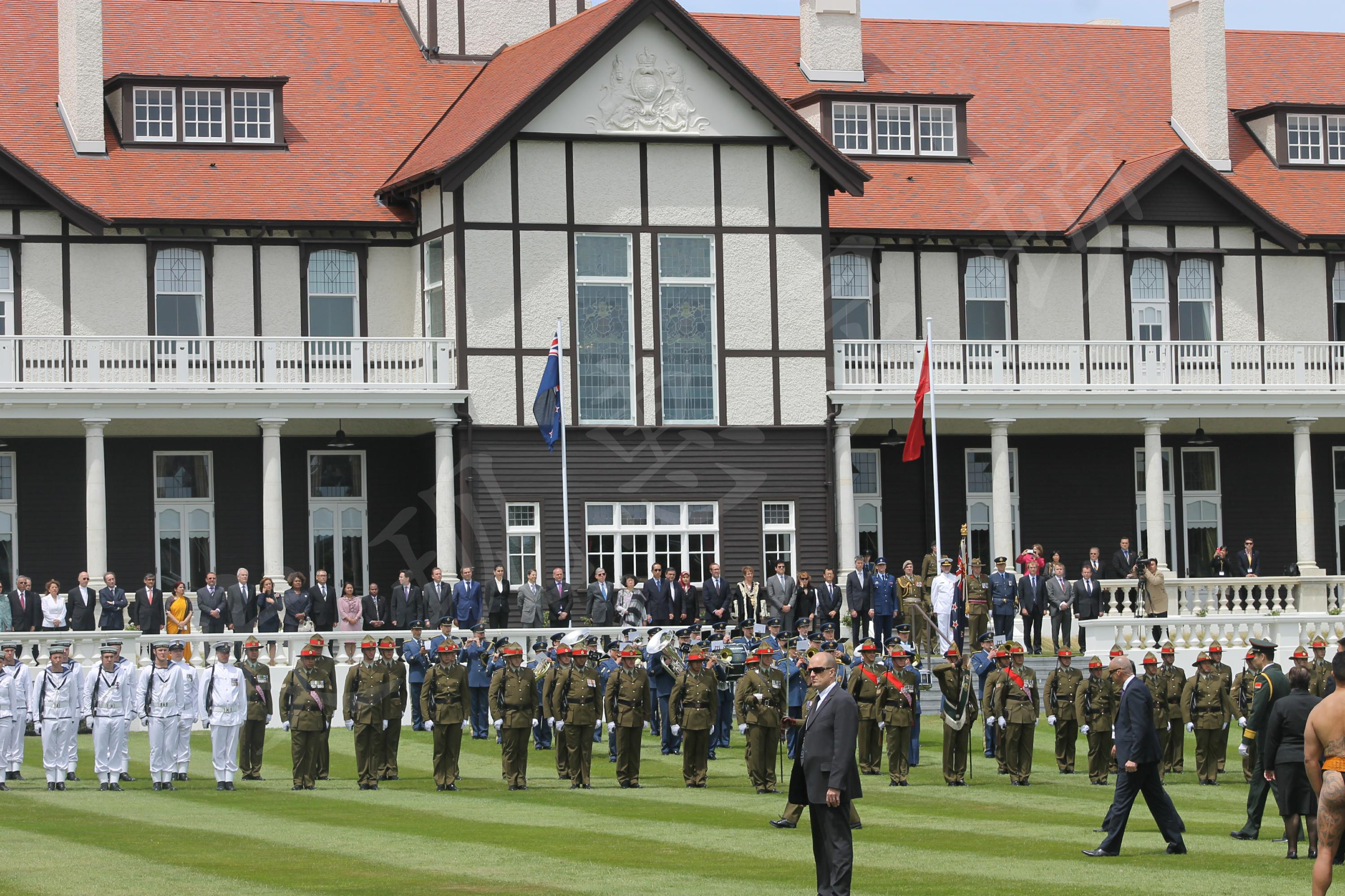 习近平主席检阅由海陆空三军组成的新西兰国防仪仗队。