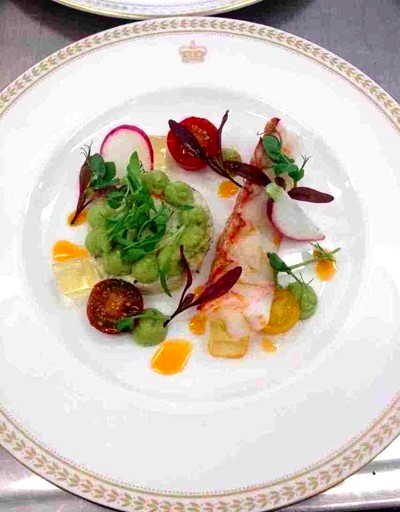 怀卡尼蟹肉、新西兰小龙虾和牛油果沙拉,配番茄果冻