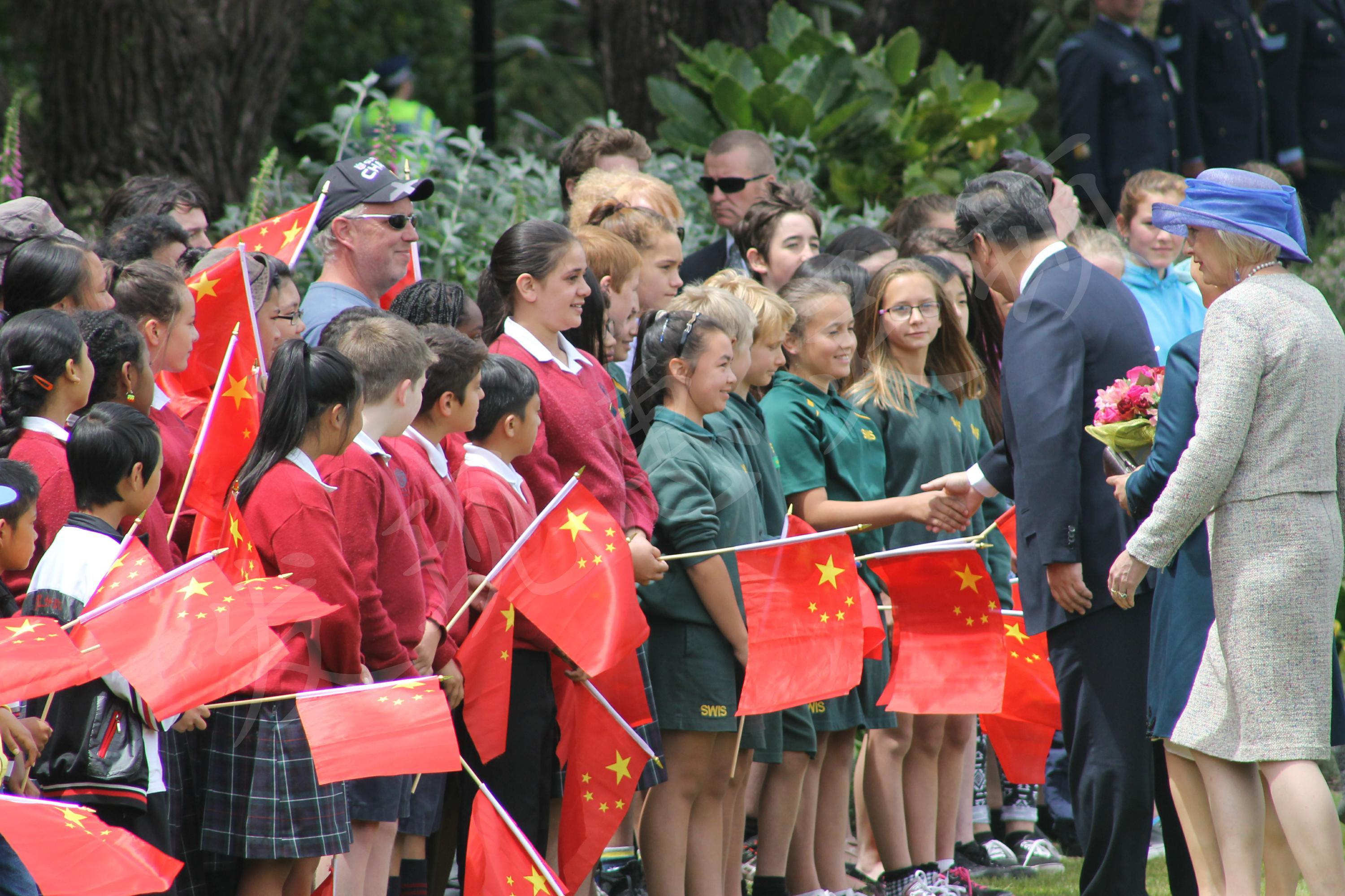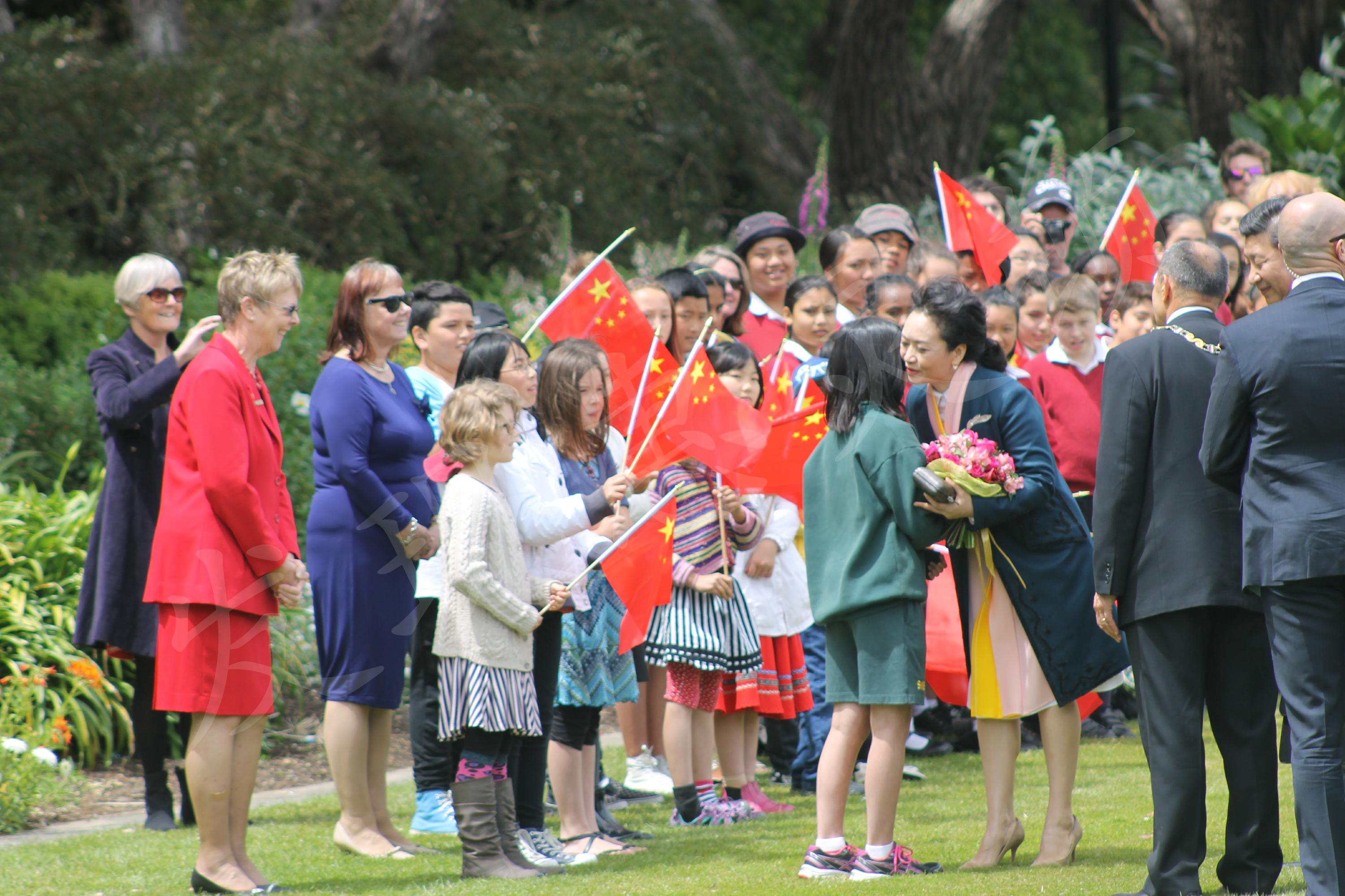 由惠灵顿本地学生组成的队伍手举中国国旗热烈欢迎习近平主席和夫人的来访。习大大与彭麻麻在新西兰总督迈特帕里及夫人的陪同下向孩子们挥手致意,彭丽媛还接受了孩子赠送的鲜花,并热情地与其拥抱。