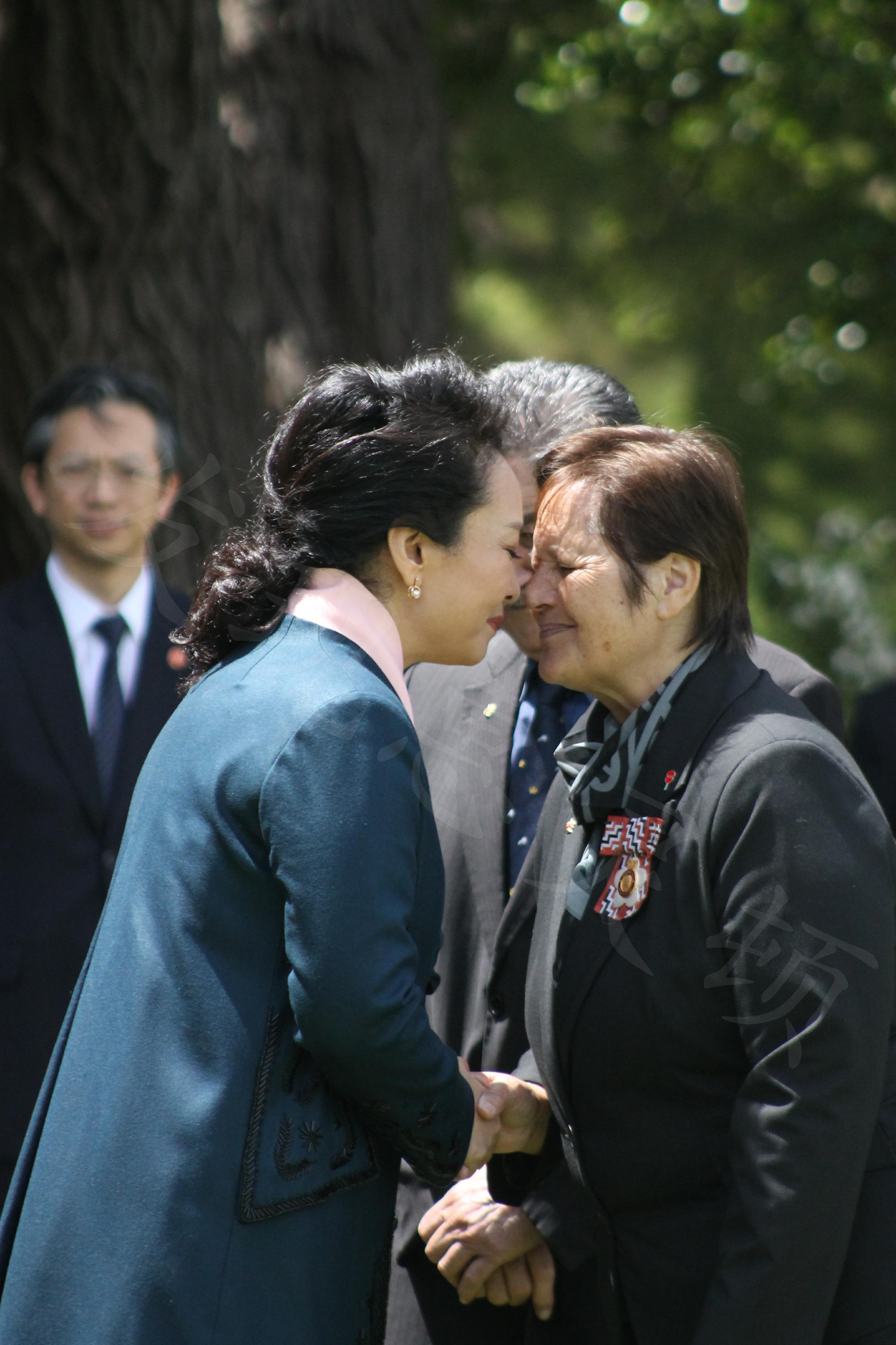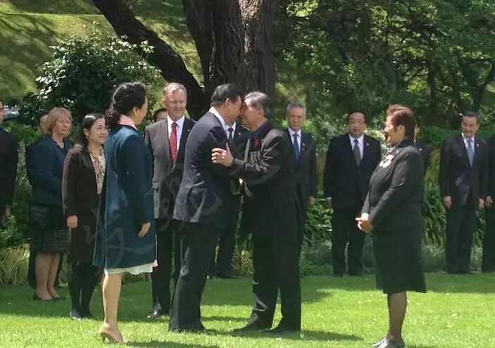 进入新西兰总督府后,习大大和彭麻麻分别与毛利老者Lewis Moeau和Hiria Hape行碰鼻礼。